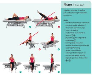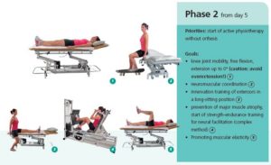 - faza: od operacije do 5. dneva: noga je imobilizirana. Potrebno je doseči samostojnost v vsakodnevnih opravilih. Z krepitvijo mišic še ne začnemo, kvadricepsa tudi v opornici ne aktiviramo.