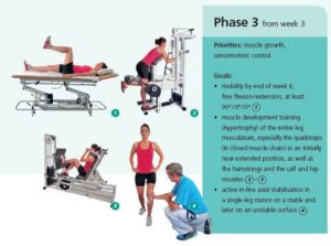 - faza: od 5. dneva do 3. tedna: aktivno in pasivno razgibavanje kolena od 0-90 stopinj, brez hiperekstenzije! Potrebno je aktivirati kvadriceps. vaje za moč začnemo delati v zaprti kinetični verigi (vpeto stopalo) od 0-60 stopinj!