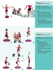 - faza: od 6. do 10. tedna: vaje za koordinacijo gibov, tek, nadaljevanje krepitve mišic, specifične vaje glede na šport, katerega poškodovanec trenira.